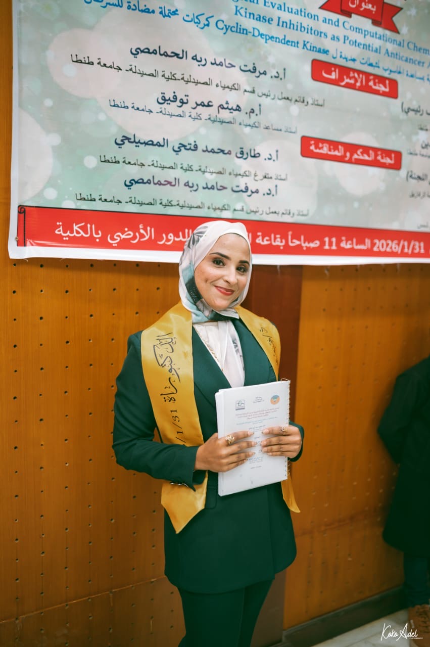 تحت رعاية السيدة أ.د/ منى عبدالحميد الأعصر – عميد الكلية، والسيدة أ.د/ إيمان جودة خضر القائم بعمل وكيل الكلية للدراسات العليا والبحوث، والسيد أ.د/ مرفت حامدربه الحمامصي قائم بعمل رئيس قسم الكيمياء الصيدلية، شهدت كلية الصيدلة جامعة طنطا يوم السبت الموافق 31 يناير 2026 انعقاد المناقشة العلنية لرسالة الدكتوراة المقدمة من الماجستير/ هبة محمدي سعد أبو سالم (مدرس مساعد بقسم الكيمياء الصيدلية)
