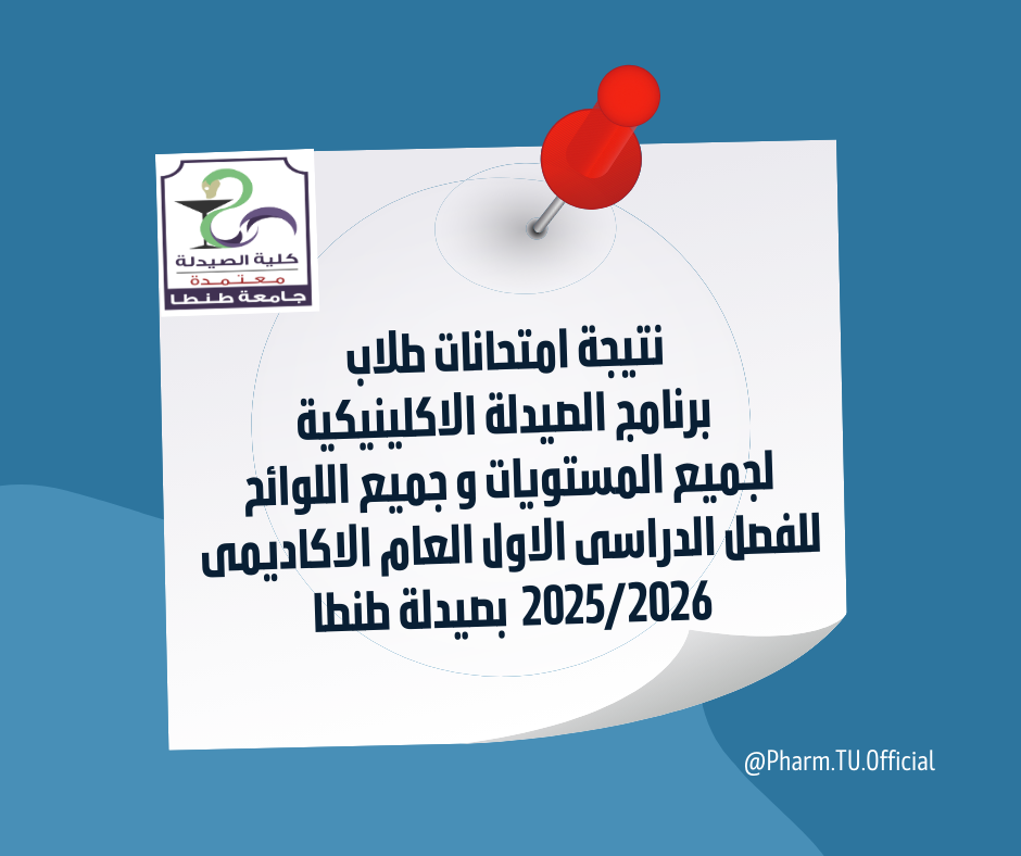 تعلن إدارة شئون التعليم والطلاب بكلية الصيدلة جامعة طنطا عن نتيجة امتحانات طلاب برنامج الصيدلة الاكلينيكية لجميع المستويات و جميع اللوائح للفصل الدراسى الاول العام الاكاديمى 2025/2026