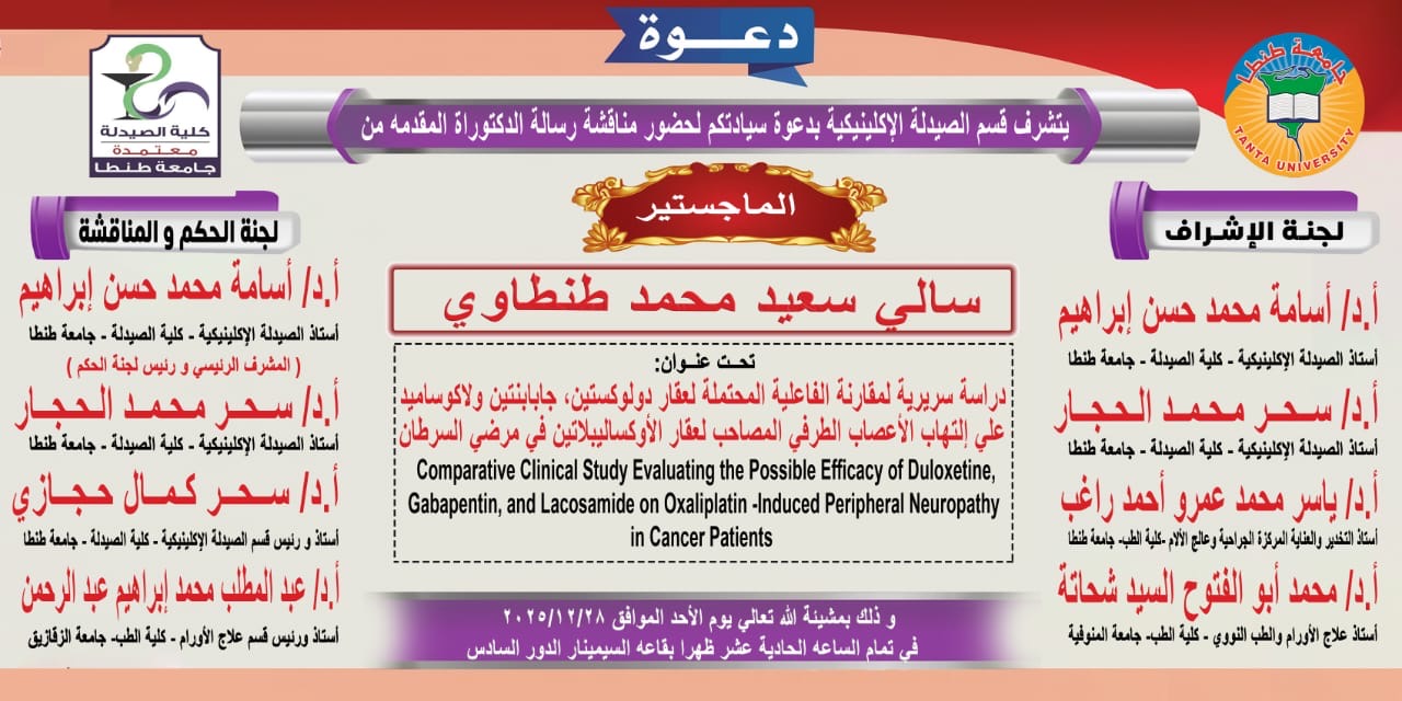 تحت رعاية السيدة أ.د/ مني عبد الحميد الأعصر عميد كلية الصيدلة جامعة طنطا، والسيدة أ.د/ ايمان جوده خضر القائم بعمل وكيل الكلية للدراسات العليا والبحوث، تعلن إدارة الدراسات العليا والبحوث بالكلية عن تحديد موعد انعقاد المناقشة العلنية لرسالة الماجستير المقدمة من الصيدلانية / سارة سعيد محمد طنطاوي