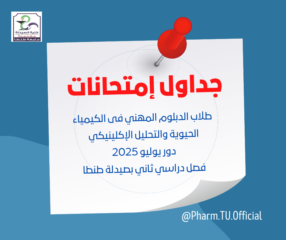 تعلن إدارة الدراسات العليا بكلية الصيدلة جامعة طنطا عن جدول امتحانات طلاب الدبلوم المهني فى الكيمياء الحيوية والتحليل الإكلينيكي دور يوليو 2025 بالفصل الدراسي الثاني من العام الجامعي 2024/2025.