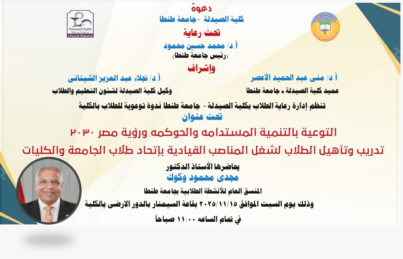 تحت رعاية السيد الأستاذ الدكتور محمد حسين محمود رئيس جامعة طنطا، وتحت إشراف السيدة الأستاذ الدكتور منى عبدالحميد الأعصر عميد كلية الصيدلة جامعة طنطا، والسيدة الأستاذ الدكتور نجلاء عبدالعزيز الشيتانى وكيل الكلية لشئون التعليم والطلاب، تنظم إدارة رعاية الطلاب بالكلية ندوة توعوية للطلاب تحت عنوان "التوعية بالتنمية المستدامة والحوكمة ورؤية مصر ٢٠٣٠، تدريب وتأهيل الطلاب لشغل المناصب القيادية باتحاد طلاب الجامعة والكليات"، يحاضرها السيد الأستاذ الدكتور مجدي محمود وكوك المنسق العام للأنشطة الطلابية بالجامعة وذلك يوم السبت الموافق ١٥ نوفمبر ٢٠٢٥ بقاعة السيمنار بالدور الأرضى بالكلية فى تمام الساعة ١١:٠٠ صباحا.