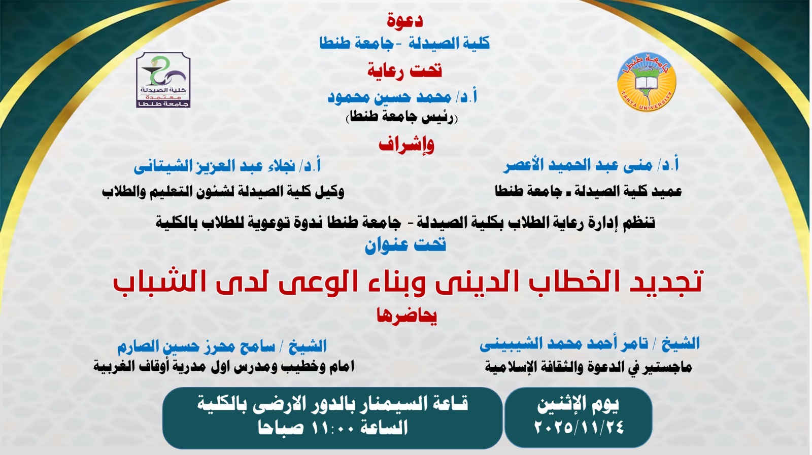 تحت رعاية السيد الأستاذ الدكتور محمد حسين محمود رئيس جامعة طنطا، وتحت إشراف السيدة الأستاذ الدكتور منى عبدالحميد الأعصر عميد كلية الصيدلة جامعة طنطا، والسيدة الأستاذ الدكتور نجلاء عبدالعزيز الشيتانى وكيل الكلية لشئون التعليم والطلاب، تعلن إدارة رعاية الطلاب بالكلية عن الندوة التوعوية للطلاب تحت عنوان"تجديد الخطاب الديني وبناء الوعي لدى الشباب" والتي يحاضرها الشيخ/ تامر أحمد محمد الشبيني - ماجستير فى الدعوة والثقافة الإسلامية، و الشيخ/ سامح محرز حسين الصارم - إمام وخطيب ومدرس أول مديرية أوقاف الغربية، وذلك يوم الاثنين الموافق ٢٤ نوفمبر ٢٠٢٥ في تمام الساعة ١١:٠٠ صباحاً بقاعة السيمنار بالدور الأرضى بالكلية.