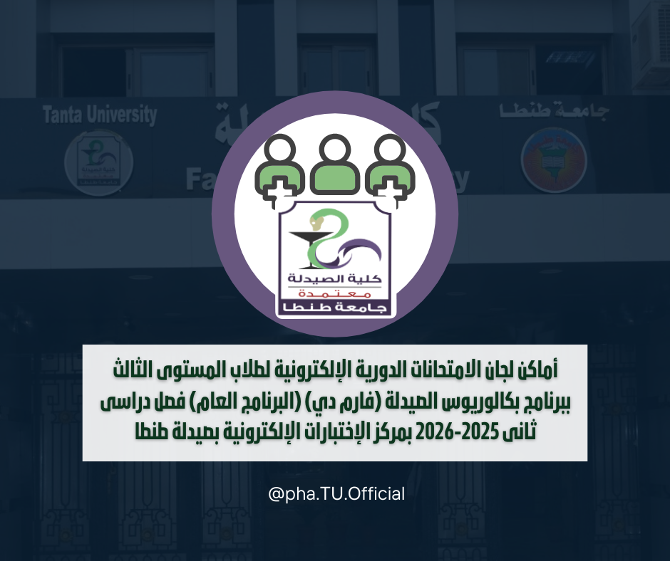 تعلن إدارة شئون التعليم والطلاب بكلية الصيدلة جامعة طنطا عن أماكن لجان الامتحانات الدورية الإلكترونية لطلاب المستوى الثالث ببرنامج بكالوريوس الصيدلة (فارم دي) (البرنامج العام) الفصل الدراسى الثانى من العام الجامعي 2025-2026، بمركز الإختبارات الإلكترونية.