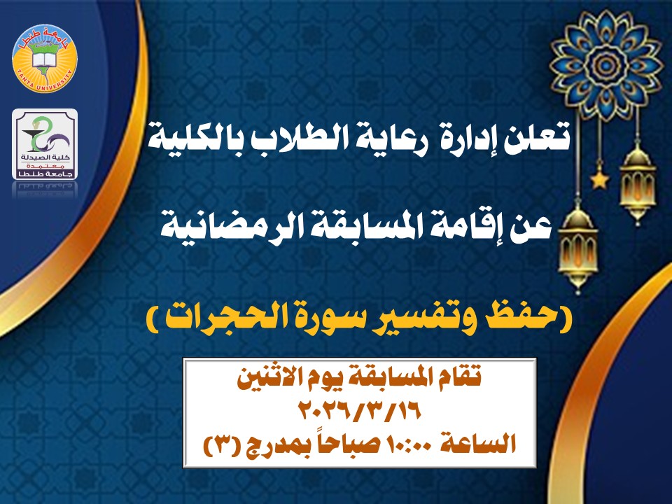 تحت رعاية السيدة الأستاذ الدكتور منى عبدالحميد الأعصر عميد كلية الصيدلة جامعة طنطا، والسيدة الأستاذ الدكتور نجلاء عبدالعزيز الشيتانى وكيل الكلية لشئون التعليم والطلاب، تعلن إدارة رعاية الطلاب بالكلية عن إقامة المسابقة الرمضانية (حفظ وتفسير سورة الحجرات) والتى ستقام يوم الاثنين الموافق 16 مارس 2026 فى تمام الساعة 10:00 صباحاً بمدرج (3) بالكلية.