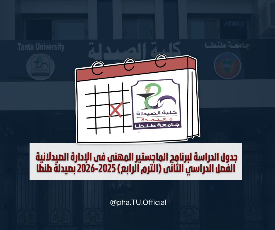 تعلن إدارة الدراسات العليا بكلية الصيدلة جامعة طنطا عن جدول الدراسة لبرنامج الماجستير المهنى فى الإدارة الصيدلانية الفصل الدراسي الثانى (الترم الرابع) 2025-2026