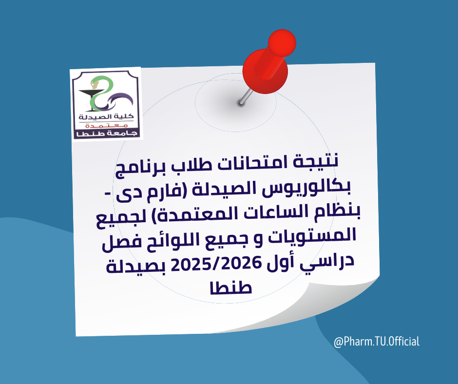 نتيجة امتحانات طلاب برنامج بكالوريوس الصيدلة (فارم دى - بنظام الساعات المعتمدة) لجميع المستويات و جميع اللوائح فصل دراسي أول 2025/2026 بصيدلة طنطا