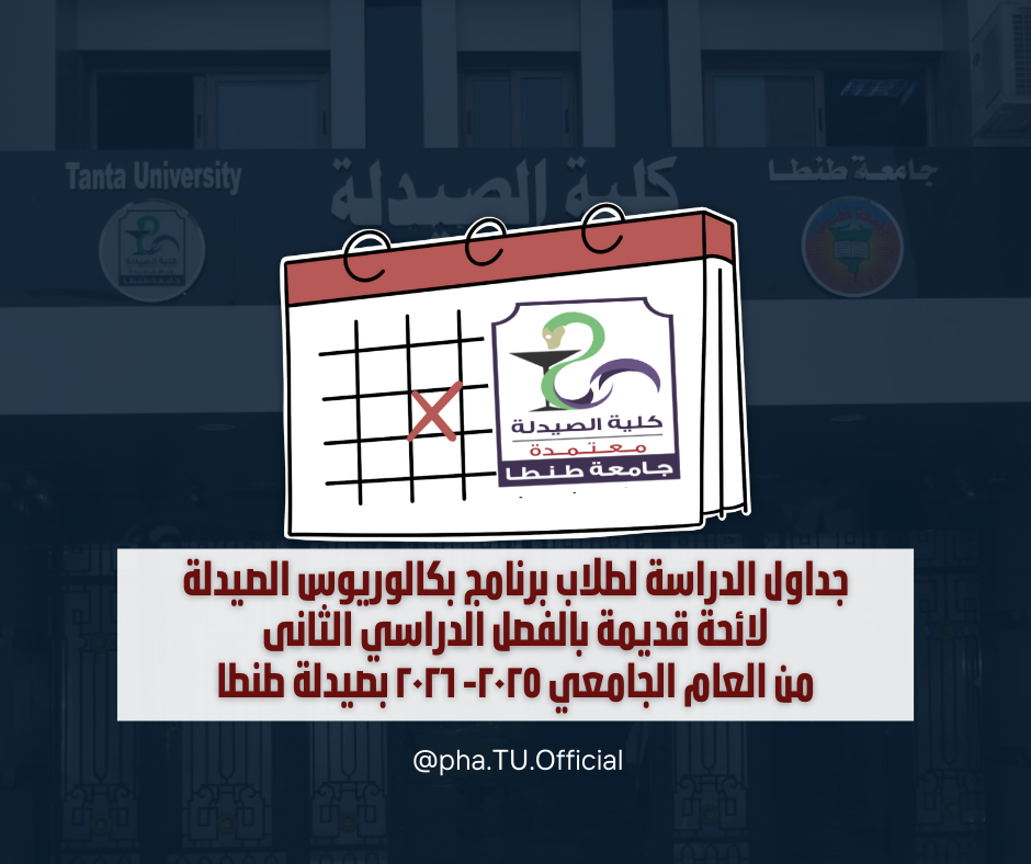 تعلن إدارة شئون التعليم والطلاب بكلية الصيدلة جامعة طنطا عن جدول الدراسة لطلاب المستوى الرابع برنامج بكالوريوس الصيدلة (فارم دى) بالفصل الدراسي الثانى من العام الجامعي ٢٠٢٥- ٢٠٢٦.