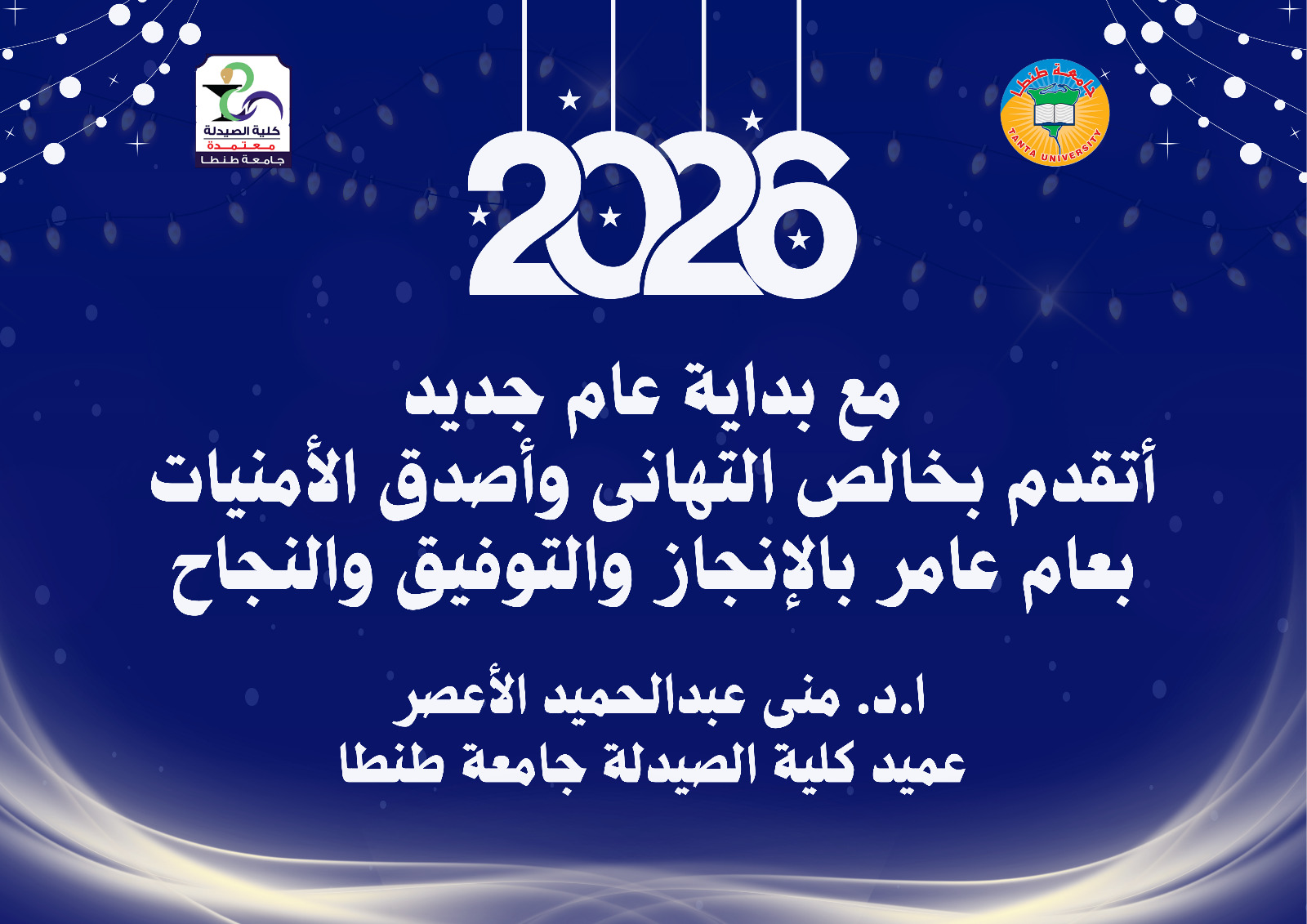 تتقدم السيدة الأستاذة الدكتورة/ منى عبد الحميد الأعصر، عميد كلية الصيدلة – جامعة طنطا، بخالص التهاني وأطيب الأمنيات إلى طلاب ومنسوبي الكلية، بمناسبة حلول العام الميلادي الجديد 2026، متمنية أن يكون عامًا حافلًا بالإنجازات والتوفيق والنجاح، ومزيدًا من التقدم والازدهار للكلية وجامعة طنطا.