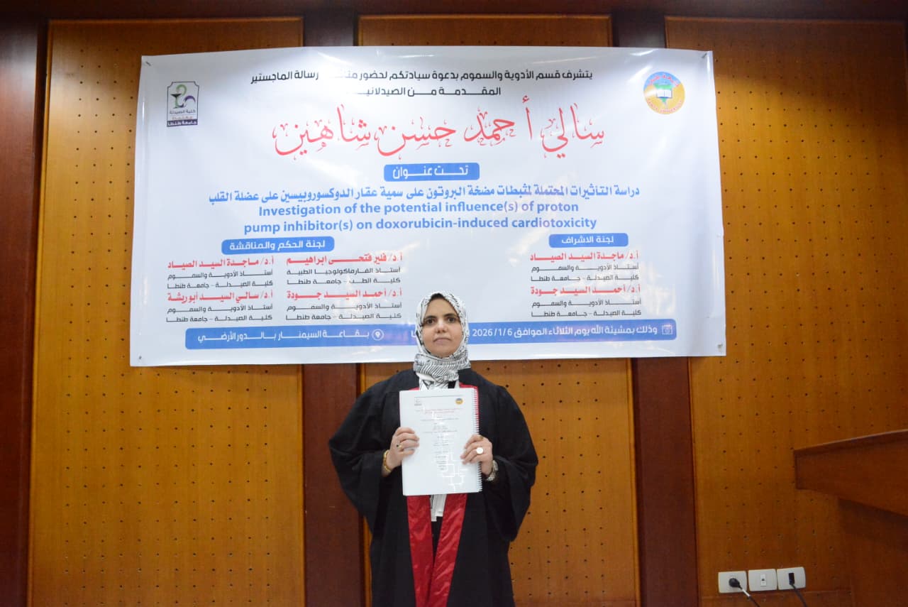 تحت رعاية السيدة الأستاذة الدكتورة/ منى عبد الحميد الأعصر، عميد كلية الصيدلة بجامعة طنطا، والسيدة الأستاذة الدكتورة/ إيمان جودة خضر، القائم بعمل وكيل الكلية للدراسات العليا والبحوث، وبإشراف السيد الأستاذ الدكتور/ أحمد السيد جودة، القائم بعمل رئيس قسم الأدوية والسموم، شهدت كلية الصيدلة بجامعة طنطا يوم الثلاثاء الموافق 6 يناير 2026 انعقاد المناقشة العلنية لرسالة الماجستير المقدمة من الصيدلانية/ سالي أحمد حسن شاهين، بقسم الأدوية والسموم