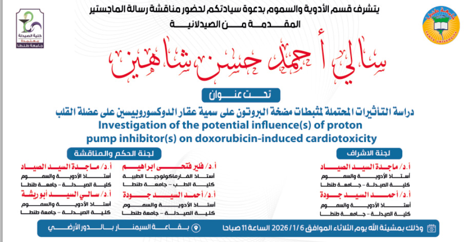 تحت رعاية السيدة أ.د/ مني عبد الحميد الأعصر عميد كلية الصيدلة جامعة طنطا، والسيدة أ.د/ ايمان جوده خضر القائم بعمل وكيل الكلية للدراسات العليا والبحوث، تعلن إدارة الدراسات العليا والبحوث بالكلية عن تحديد موعد انعقاد المناقشة العلنية لرسالة الماجستير المقدمة من الصيدلانية / سالي أحمد حسن شاهين يوم الثلاثاء الموافق 6 يناير 2026 تحت عنوان "دراسة التأثيرات المحتملة لمثبطات مضخة البروتون على سمية عقار الدوكسوروبيسين على عضلة القلب"